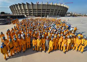 Para celebrar, os 3.000 operários da Minas Arena que atualmente trabalham na modernização do estádio se reuniram para uma foto comemorativa. Cada um deles vai receber uma cópia como presente pelo aniversário do Mineirão.