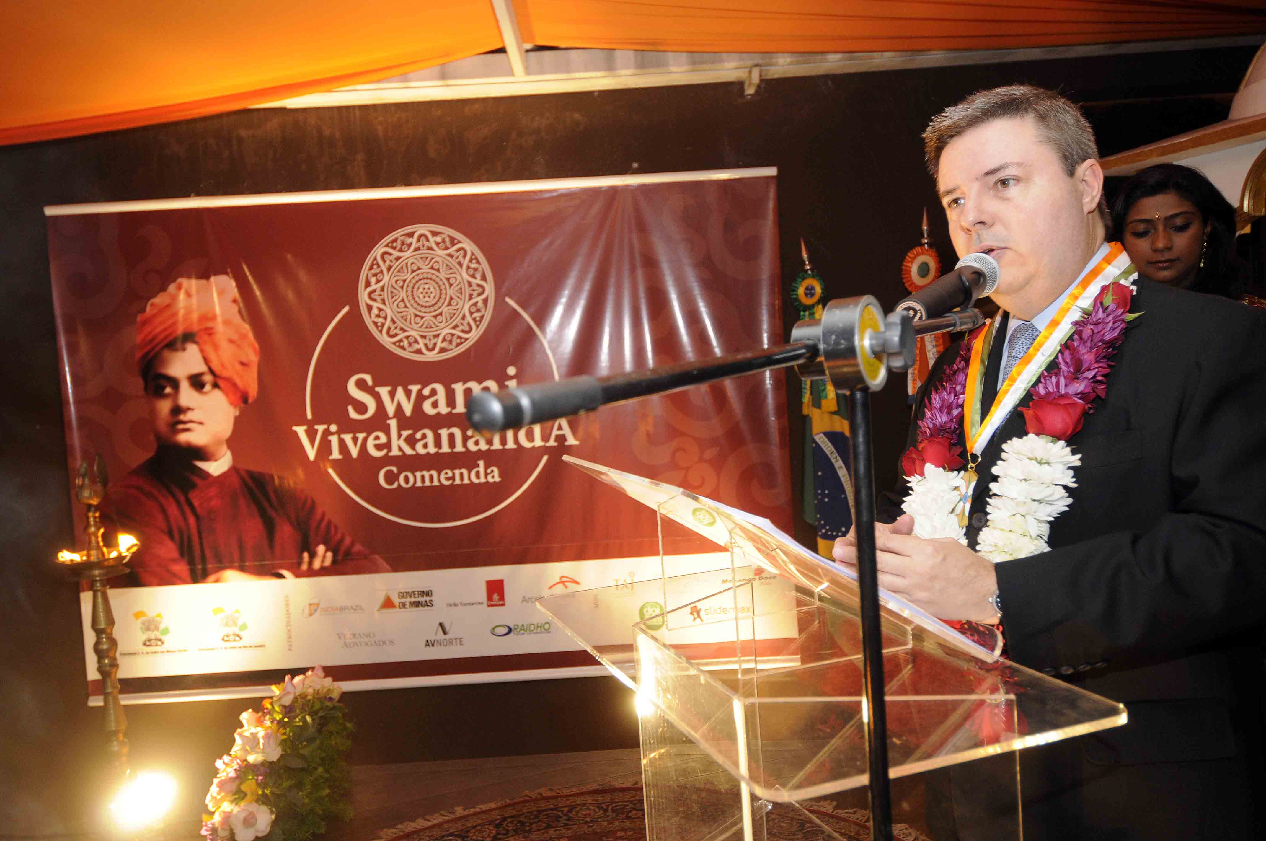 O governador Antonio Anastasia foi homenageado, nessa quinta-feira (4), em Belo Horizonte, com a Comenda Swami Vivekananda, que homenageia personalidades e entidades que contribuem para ampliar as relações entre a Índia e o Brasil. A comenda é uma iniciativa da Câmara de Comércio Índia-Brasil e do Consulado da Índia em Minas Gerais. Além do governador, outras 12 personalidades e empresas receberam a honraria.
