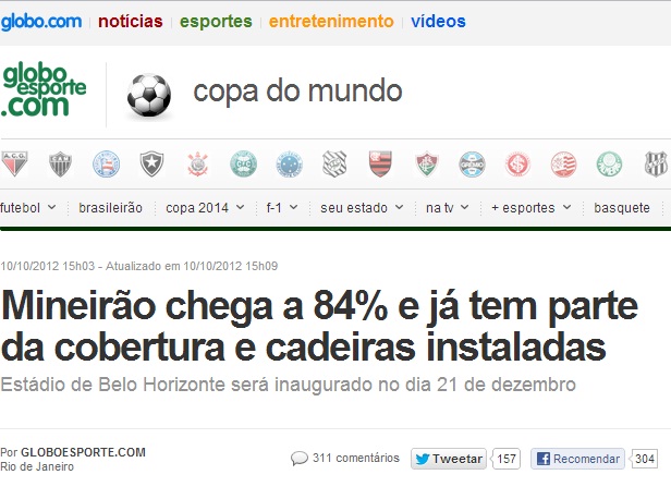 Estádio de Belo Horizonte está com os trabalhos avançados e tem a previsão de ser inaugurado em dezembro, noticia o G1