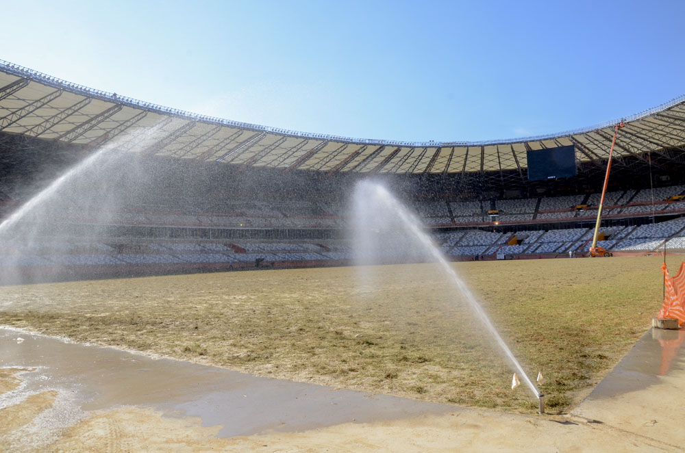 O gramado do estádio já está pronto e será apresentado à imprensa na tarde desta sexta-feira. A grama foi plantada em abril deste ano numa fazenda de Bonsucesso, interior do estado. Após ser lavado a seco, o material foi transportado em caminhão refrigerado a 5º C até a capital. No total, cerca de 540 mil mudas serão plantadas no gramado de 105m x 68m de dimensão. Todas colocadas à mão sobre uma camada arenosa formada de matéria orgânica, fibra e resíduos elásticos. Após o plantio, uma máquina conhecida como cultivadeira vai rolar sobre o tapete verde para fixar as mudas ao solo. A espécie escolhida foi a Bermuda Celetration por ser mais resistente que as demais espécies ao clima brasileiro.