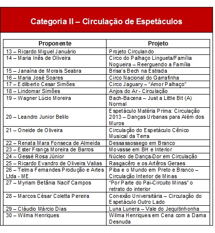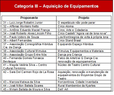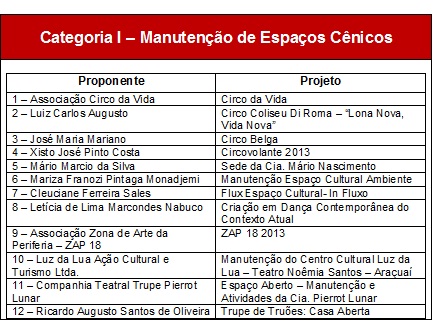 Os projetos contemplados em três categorias (Manutenção de Espaços Cênicos, Circulação de Espetáculos Cênicos e Aquisição de Equipamento e Materiais) recebem recursos para manter espaços culturais, valores correspondentes à venda de ingressos para alunos e professores de escolas públicas, aquisição e renovação de equipamentos e lonas de circos.