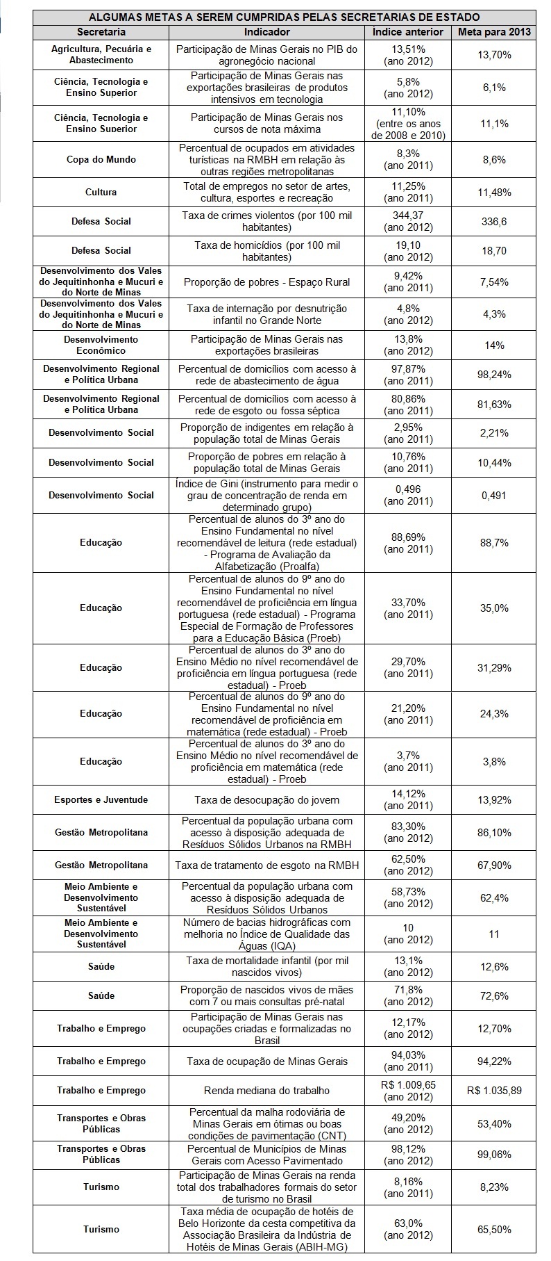 O Acordo de Resultados é uma iniciativa do Governo de Minas que busca garantir que os objetivos estratégicos traçados pela administração pública para a melhoria da vida do cidadão sejam, de fato, alcançados. Em uma segunda etapa, o Acordo de Resultados prevê metas estipuladas para cada servidor em consonância com os indicadores finalísticos, atrelados ao Plano Mineiro de Desenvolvimento Integrado (PMDI), que contempla objetivos de longo prazo, para os anos de 2015, 2023 e 2030.