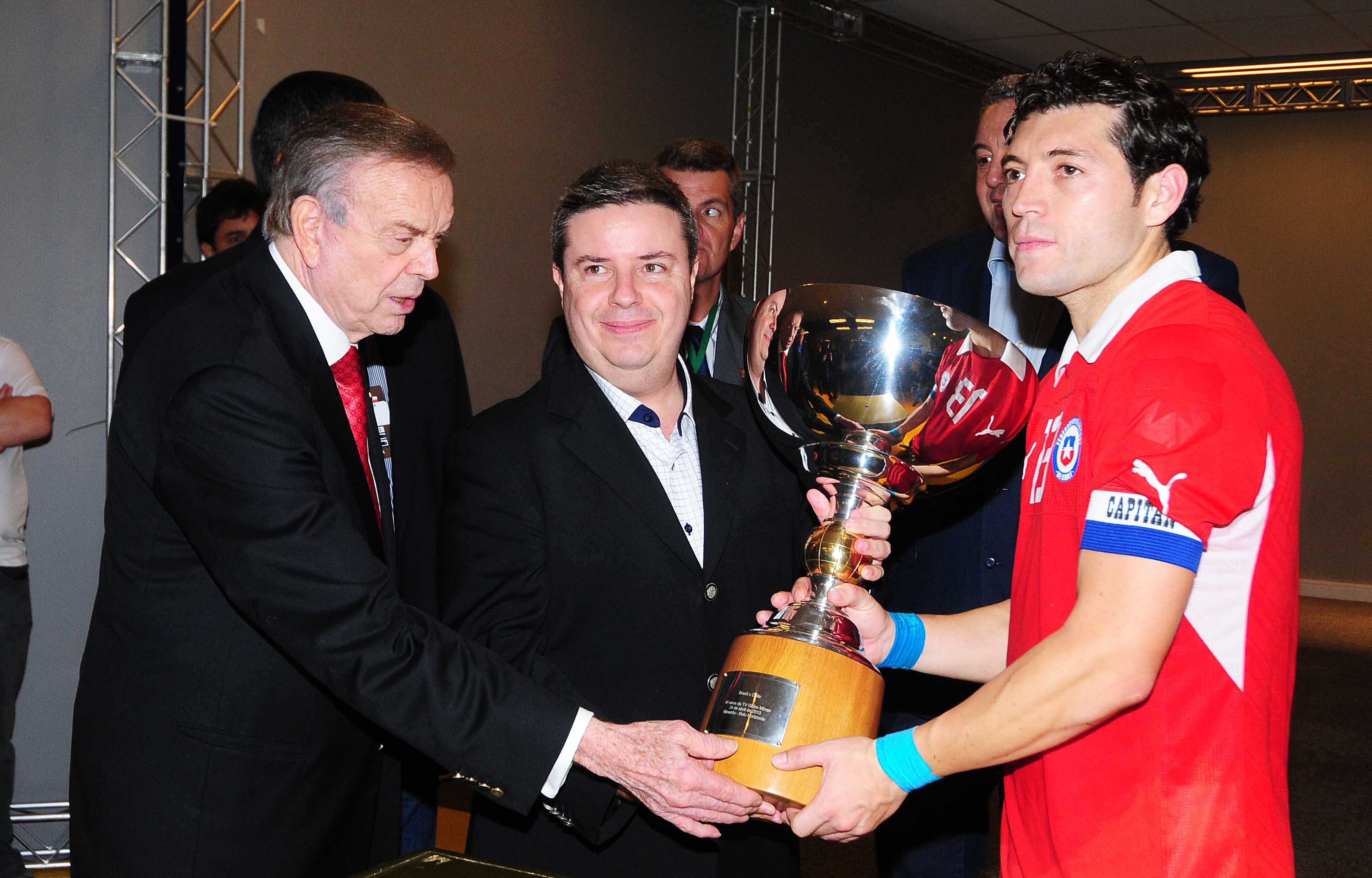 No intervalo do jogo, o governador recebeu do presidente da Federação Mineira de Futebol (FMF), Paulo Schettino, uma flâmula da seleção brasileira, durante descerramento de placa que homenageou o senador Aécio Neves, responsável pelo início das obras do estádio. Ao final da partida, Anastasia entregou ao capitão da seleção chilena, José Rojas, a taça destinada ao vencedor e, por sorteio, foi destinada à equipe do Chile.