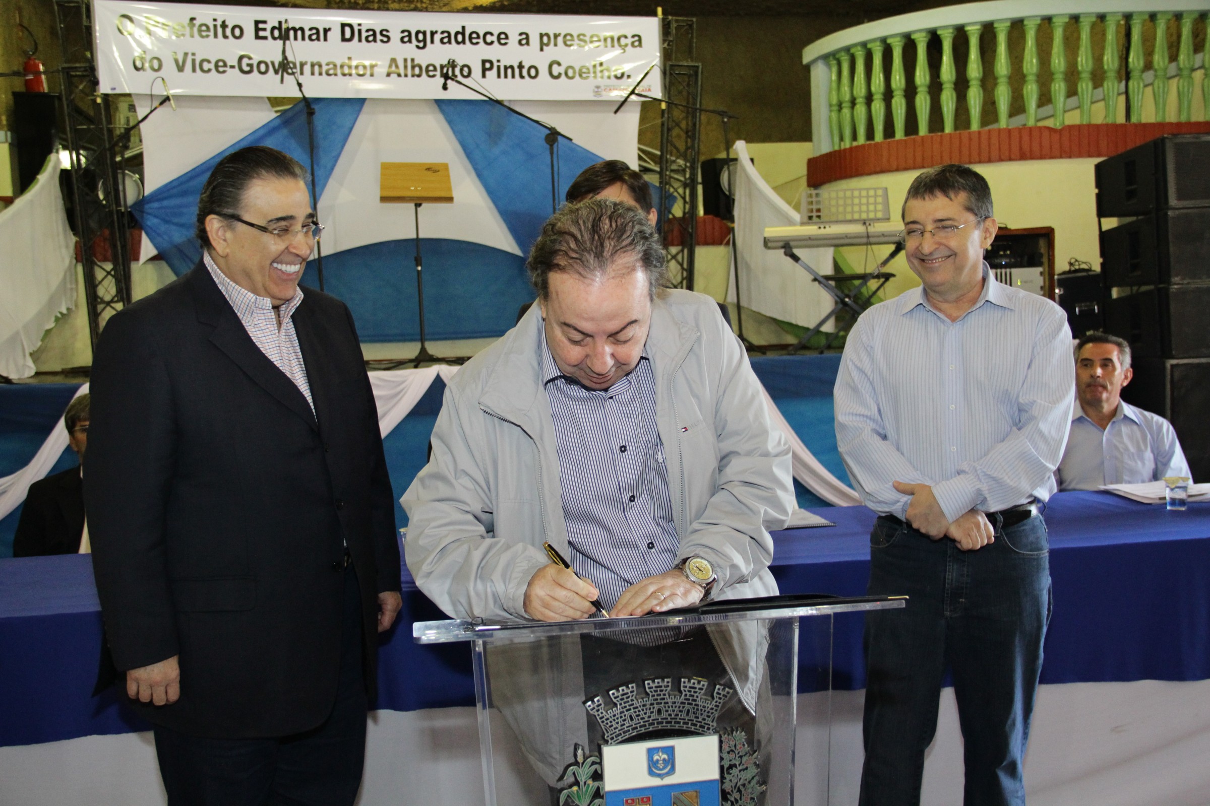 Ao lado do vice-governador Alberto Pinto Coelho e prefeito de Camanducaia, secretário Danilo de Castro assina o projeto das obras