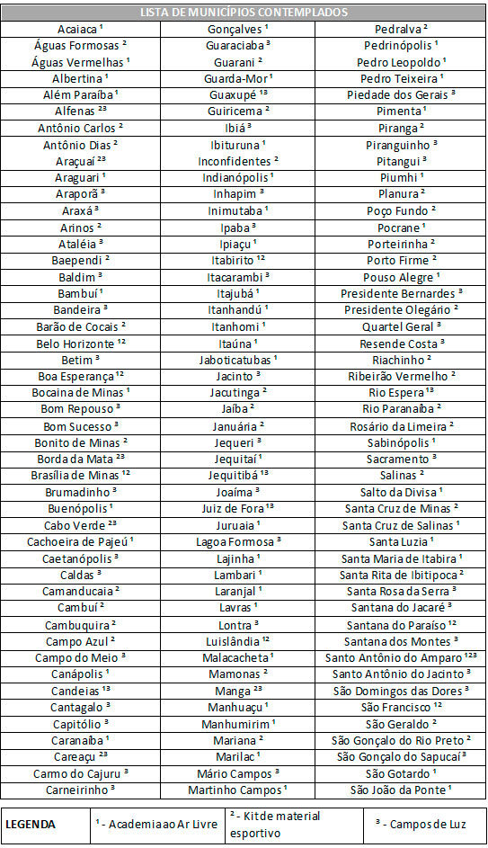 Serão instalados 127 equipamentos do programa Academia ao Ar Livre em locais públicos de 95 municípios (além de cinco unidades prisionais) e 634 kits com materiais esportivos para 93 municípios. Além disso, 115 campos amadores e quadras poliesportivas de 94 cidades, em todas as regiões de Minas Gerais, receberão iluminação pública.