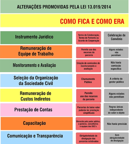 Outras mudanças de destaque na lei, quando da tramitação do PLV, foi a retirada da obrigatoriedade de indicação de um responsável solidário para execução das atividades e cumprimento de metas, e ainda a obrigatoriedade, quando envolve recursos de fundos públicos, do monitoramento pelo conselho gestor do fundo. No caso da assistência social, isto se aplica ao Fundo Estadual de Assistência Social, gerido pelo Conselho Estadual de Assistência Social (Ceas).