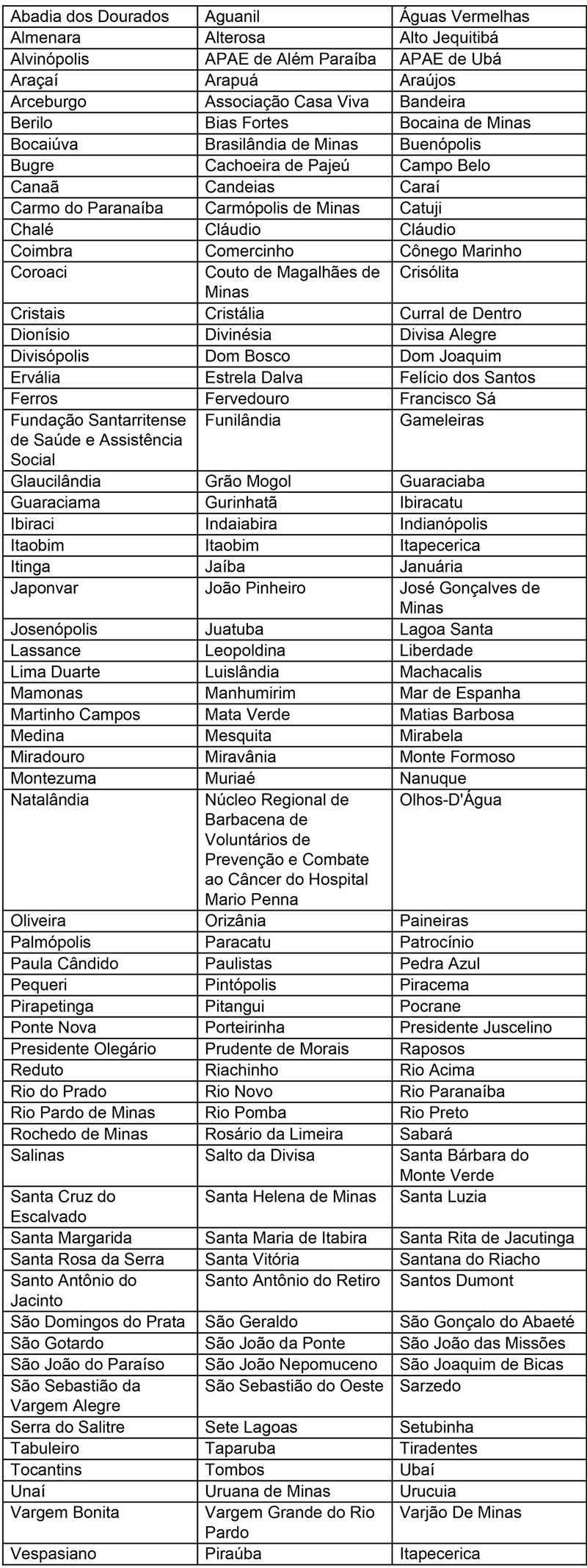 - SAMU: Itaúna (Consórcio CISURG), Divinópolis (Consórcio CISURG), Barbacena (Consórcio CISURG), Ipatinga, Itabira, Mariana, Patos de Minas, Sete Lagoas, Governador Valadares e Uberaba.