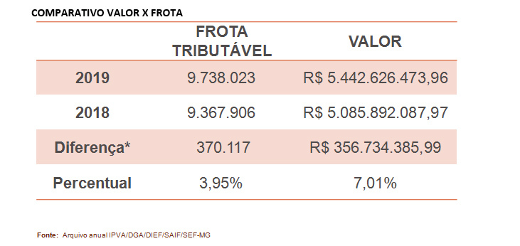 O valor emitido do IPVA para 2019 é de R$ 5,44 bilhões para um total de 9,7 milhões de veículos emplacados até 19 de outubro deste ano. A expectativa de incremento de arrecadação em relação a 2018 é de 7% - R$ 356 milhões a mais. A frota tributável de IPVA teve um aumento de 370 mil veículos (3,95%) em relação a 2018, totalizando 9.738.023.