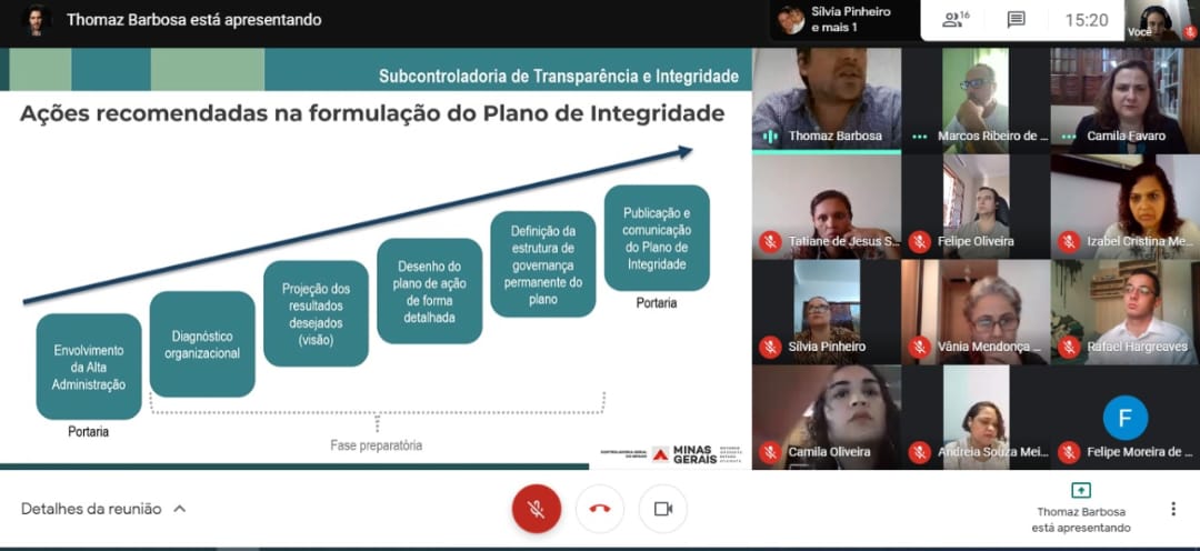 A servidora Camila Favaro, representante do Gabinete da secretaria, lembrou à apresentação da reunião em fevereiro e falou sobre os esforços que o gabinete vem desempenhando, mesmo neste contexto de pandemia e teletrabalho, para a elaboração e instituição de um plano de integridade consistente para a Segov.